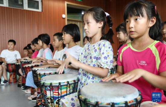 8月4日,在辽宁省沈阳市浑南区第九小学,参加暑期托管班的学生学习非洲鼓。新华社记者 王乙杰 摄