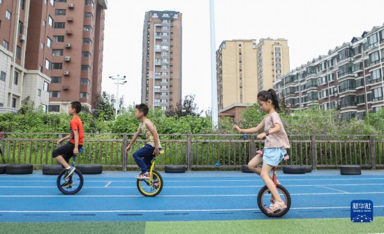 8月4日,在辽宁省沈阳市浑南区第九小学,参加暑期托管班的学生练习独轮车。新华社记者 王乙杰 摄