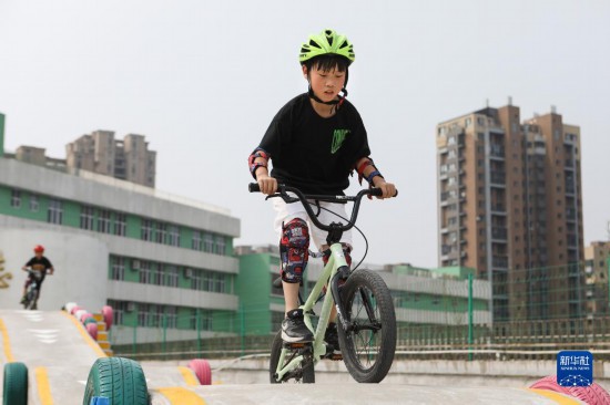 8月4日,在辽宁省沈阳市浑南区第九小学,参加暑期托管班的学生练习自行车。新华社记者 王乙杰 摄
