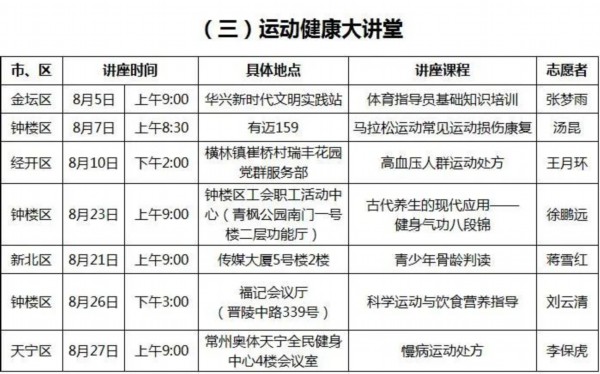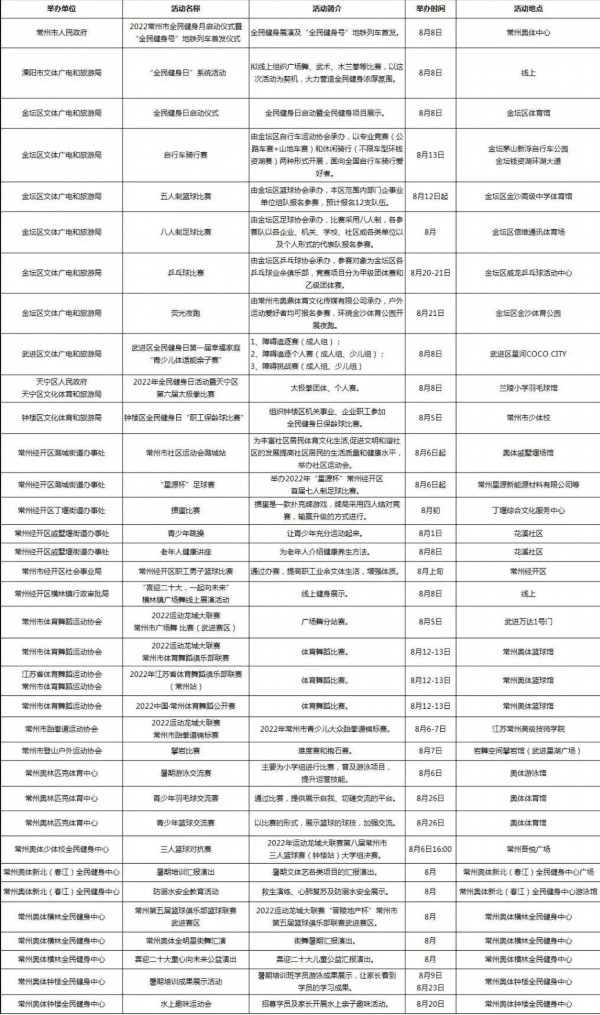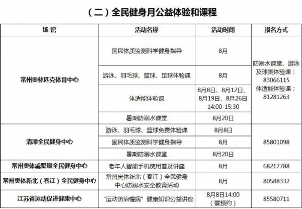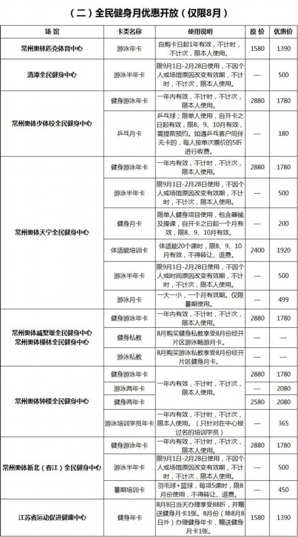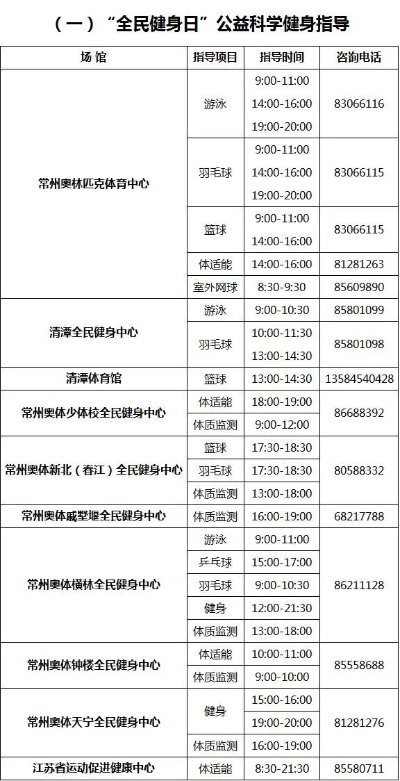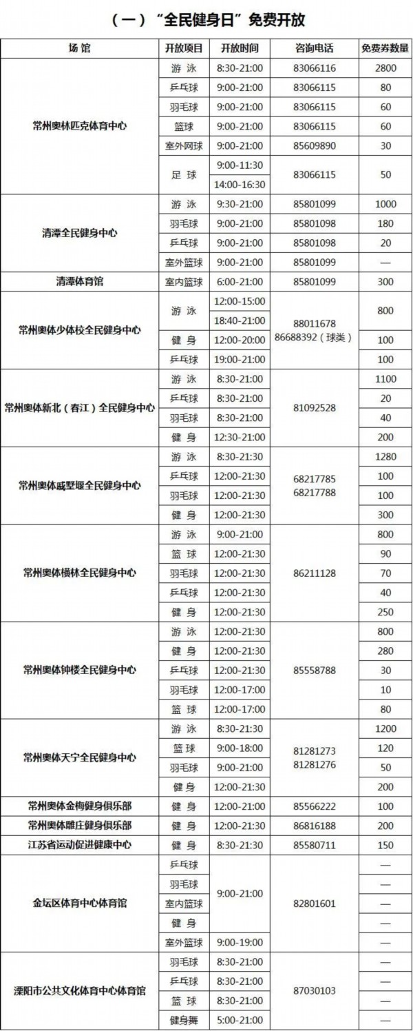 今年8月8日是全国第14个“全民健身日”,8月是常州市第5个全民健身月。为进一步提高人民群众身体素质,倡导健康向上的生活方式,全民健身日当天,公共体育场馆及局属健身俱乐部全面免费向市民开放。因疫情防控要求和场馆接待能力限制,公共体育场馆及局属健身俱乐部开放实行免费券管理(表格中免费券数量为同一时间场馆的最大容载量),市民可以体验场馆的免费开放服务,免费券旨在引导市民错峰健身。