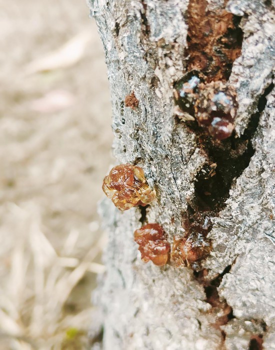 桃胶都牢牢黏附在枝干上,有的未干透,摸上去感觉黏稠,能拉丝;有的桃胶已被烈日晒干,摸上去外层稍硬,内里柔软,捏着就像孩子们吃的QQ糖。桃胶闻着并没有浓烈的香味,而是很淡的植物清香。