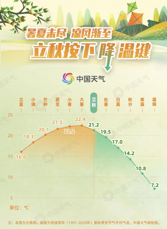 中国天气网通过盘点1991年至2020年气象大数据发现,立秋是由热转凉的交接节气,全国平均气温开始从逐步升高转为下降。
