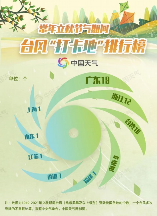 今天(8月7日)开始,我国进入立秋节气,这是秋季的第一个节气,意味着夏去秋来。对我国大部而言,立秋并不等于入秋,盛夏的暑热还没褪去,秋意也并未登场。中国天气网梳理气象大数据发现立秋还是台风活跃的时段,特别推出常年立秋期间台风“打卡地”排行榜,看看哪里台风最活跃。