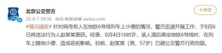 荔枝新闻讯 8月7日,北京公交警方发布一则情况通报:针对网传有人在地铁6号线列车上小便的情况,警方迅速开展工作,于8月6日将违法行为人赵某某查获。经查,8月4日16时许,该人酒后乘坐地铁6号线时,在列车上随地小便,造成恶劣影响。目前,赵某某(男,57岁)已被公交警方行政拘留。