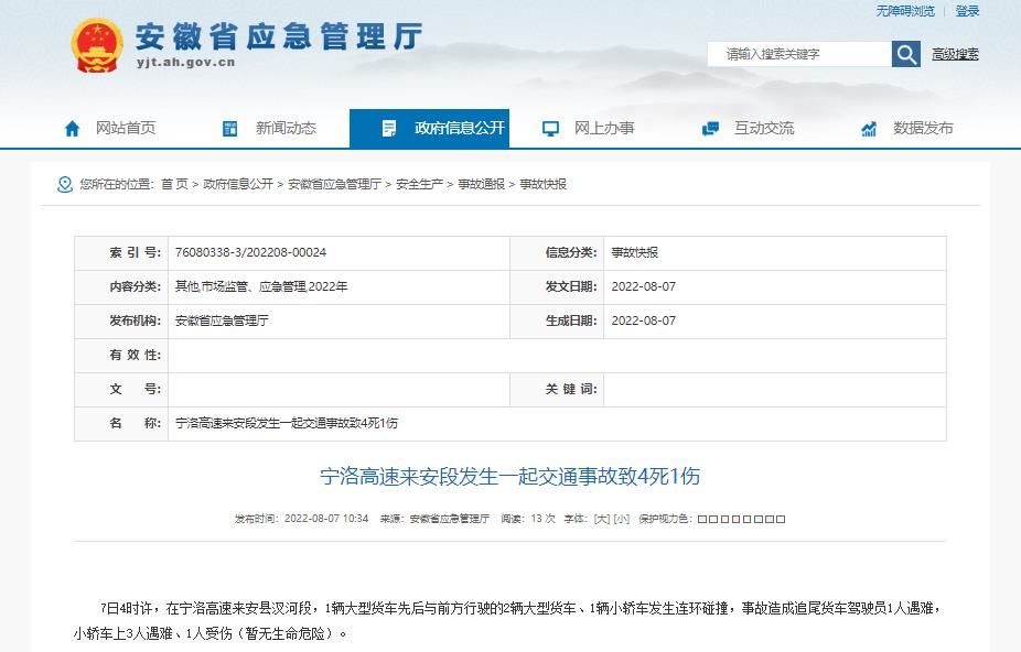 荔枝新闻讯 安徽省应急管理厅8月7日消息,今天(8月7日)4时许,在宁洛高速安徽来安县汊河段,1辆大型货车先后与前方行驶的2辆大型货车、1辆小轿车发生连环碰撞,事故造成追尾货车驾驶员1人遇难,小轿车上3人遇难、1人受伤(暂无生命危险)。