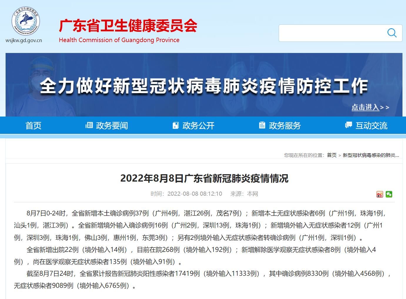 荔枝新闻讯 据广东卫健委官网消息,8月7日0-24时,全省新增本土确诊病例37例(广州4例,湛江26例,茂名7例);新增本土无症状感染者6例(广州1例,珠海1例,汕头1例,湛江3例)。全省新增境外输入确诊病例16例(广州2例,深圳13例,珠海1例);新增境外输入无症状感染者12例(广州1例,深圳3例,珠海1例,佛山3例,惠州1例,东莞3例);另有2例境外输入无症状感染者转确诊病例(广州1例,深圳1例)。