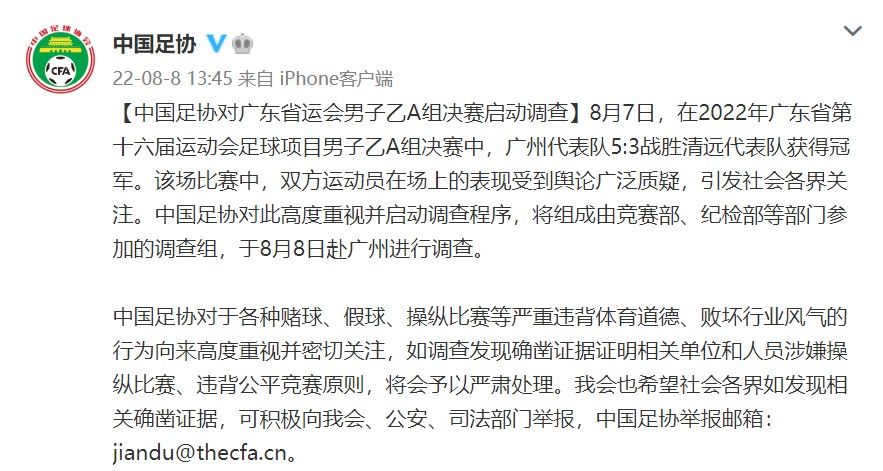 荔枝新闻讯 据中国足协官方微博消息,8月7日,在2022年广东省第十六届运动会足球项目男子乙A组决赛中,广州代表队5:3战胜清远代表队获得冠军。该场比赛中,双方运动员在场上的表现受到舆论广泛质疑,引发社会各界关注。中国足协对此高度重视并启动调查程序,将组成由竞赛部、纪检部等部门参加的调查组,于8月8日赴广州进行调查。