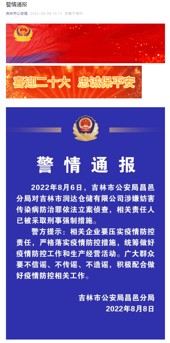 2022年8月6日,吉林市公安局昌邑分局对吉林市润达仓储有限公司涉嫌妨害传染病防治罪依法立案侦查,相关责任人已被采取刑事强制措施。