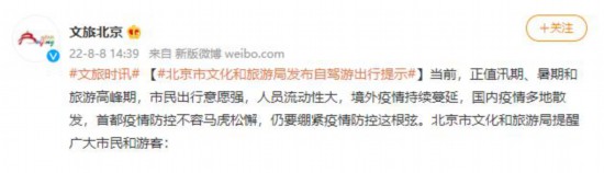 央视网消息:8月8日,北京市文化和旅游局发文布自驾游出行提示。