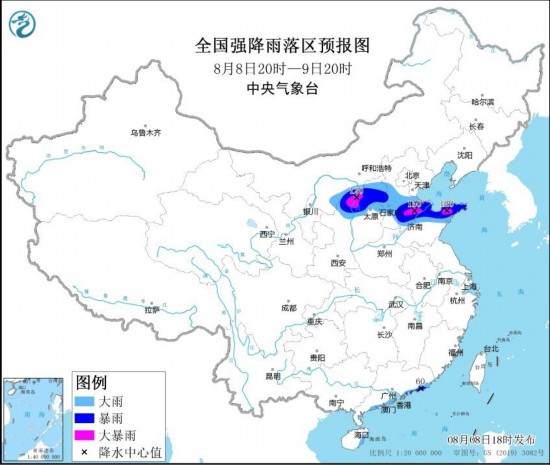 预计,8月8日20时至9日20时,内蒙古河套地区、陕西北部、山西中北部、河北中南部、山东北部和东部、广东南部沿海、海南岛东部沿海等地部分地区有大到暴雨,其中,陕西东北部、山西西北部、山东西北部和东部等地局地有大暴雨(100~150毫米)。上述部分地区伴有短时强降水(最大小时降雨量30~60毫米,局地可超过80毫米),局地有雷暴大风等强对流天气。