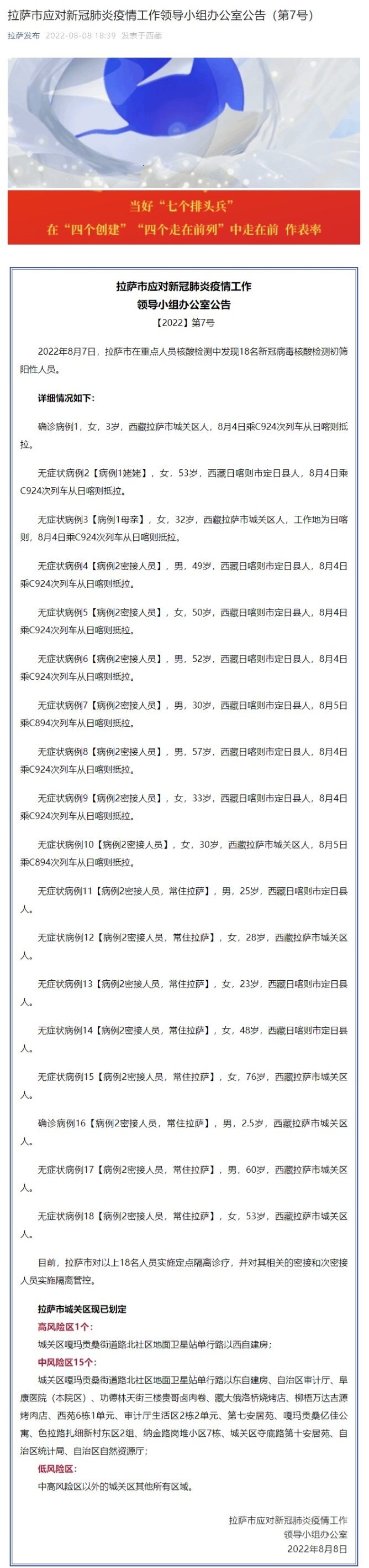 无症状病例7【病例2密接人员】,男,30岁,西藏日喀则市定日县人,8月5日乘C894次列车从日喀则抵拉。