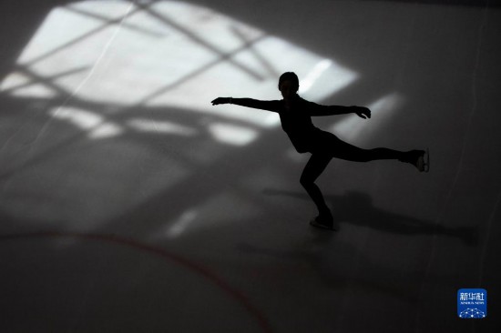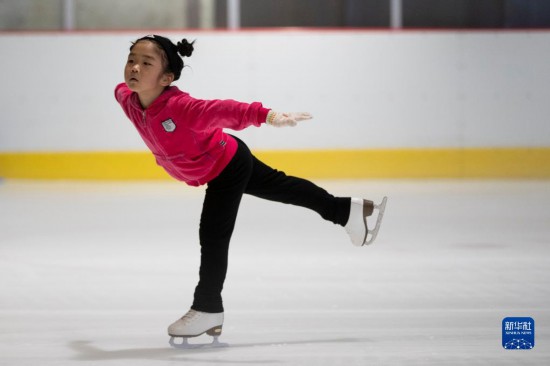 8月8日,在西安奥佳冰上运动俱乐部,12岁的王丰安练习花样滑冰,王丰安学习花样滑冰四年。新华社记者 李一博 摄
