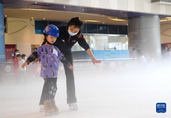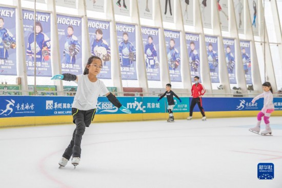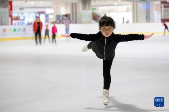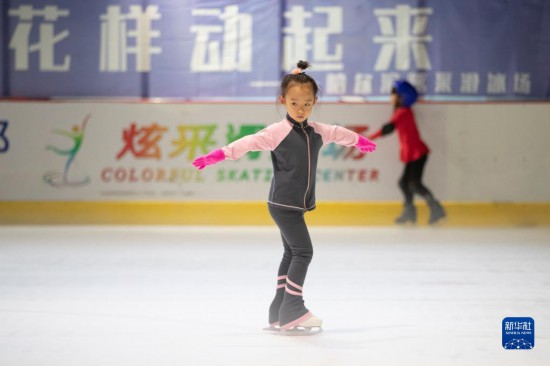 8月8日,5岁的楚欣禾在哈尔滨炫采滑冰场哈西店冰场滑冰。新华社记者 张涛 摄