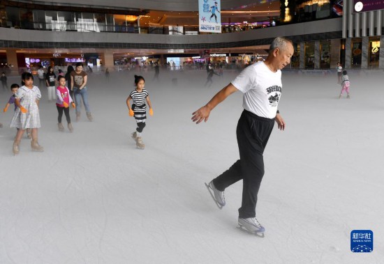 8月8日,68岁的孙胜兴(右前)在青岛冰纷万象滑冰场体验滑冰。新华社记者 李紫恒 摄