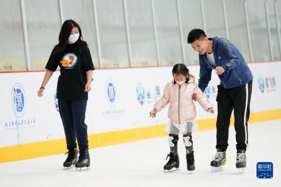 8月8日,在北京星飞翔冰上运动中心,18岁的高三毕业生邓正阳(右)、杜嘉怡(左)帮助同样来体验滑冰的一名5岁小朋友学习滑冰。新华社记者 鞠焕宗 摄