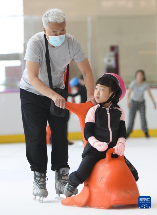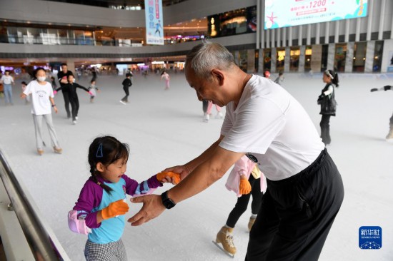 8月8日,73岁的吴成玉(上)带着5岁的外孙女赵若云在沈阳冰纷万象滑冰场体验滑冰。新华社记者 王乙杰 摄