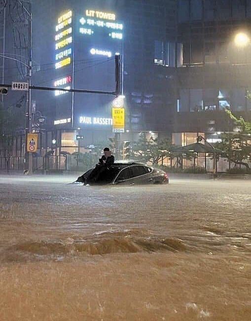 首尔遭遇特大暴雨,市民坐在车顶