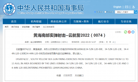 云航警0074/22,黄海南部,8月11日至8月13日每日0900时至1600时在34-52N 120-00E、34-52N 120-13E、34-44N 120-13E和34-44N 120-00E四点连线范围内进行实弹射击,禁止驶入。