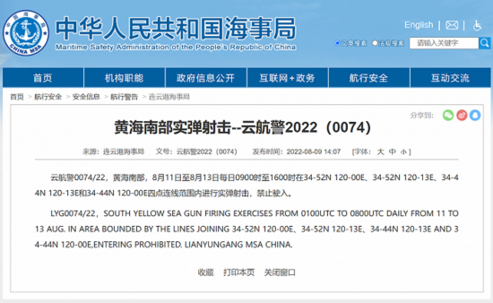 中国海事局网站8月9日消息,连云港海事局发布航行警告信息:云航警0074/22,黄海南部,8月11日至8月13日每日0900时至1600时在34-52N 120-00E、34-52N 120-13E、34-44N 120-13E和34-44N 120-00E四点连线范围内进行实弹射击,禁止驶入。