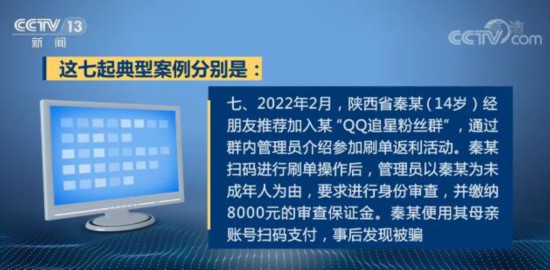七、2022年2月,陕西省秦某(14岁)经朋友推荐加入某“QQ追星粉丝群”,通过群内管理员介绍参加刷单返利活动。秦某扫码进行刷单操作后,管理员以秦某为未成年人为由,要求进行身份审查,并缴纳8000元的审查保证金。秦某便用其母亲账号扫码支付,事后发现被骗。