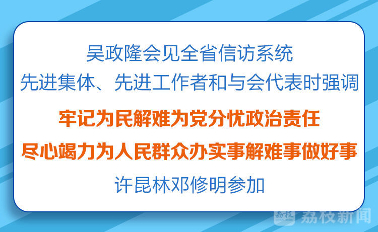 荔枝新闻讯 信访工作是党的群众工作的重要组成部分,是了解社情民意的重要窗口。8月9日上午,省委书记吴政隆在会见全省信访系统先进集体、先进工作者和全省信访工作会议与会代表时强调,要坚持以习近平新时代中国特色社会主义思想为指导,深入学习贯彻习近平总书记关于加强和改进人民信访工作的重要思想,深刻领悟“两个确立”的决定性意义,增强“四个意识”、坚定“四个自信”、做到“两个维护”,全面落实党中央“疫情要防住、经济要稳住、发展要安全”的重大要求,坚持人民立场、人民至上,牢记为民解难、为党分忧的政治责任,尽心竭力为人民群众办实事解难事做好事,进一步厚植为民情怀、践行初心使命,不断夯实党的执政根基,为全省担起“勇挑大梁”的重大责任,为保持平稳健康的经济环境、国泰民安的社会环境、风清气正的政治环境作出新的更大贡献,以实际行动迎接党的二十大胜利召开。省长许昆林,省委副书记、省委政法委书记邓修明参加会见。