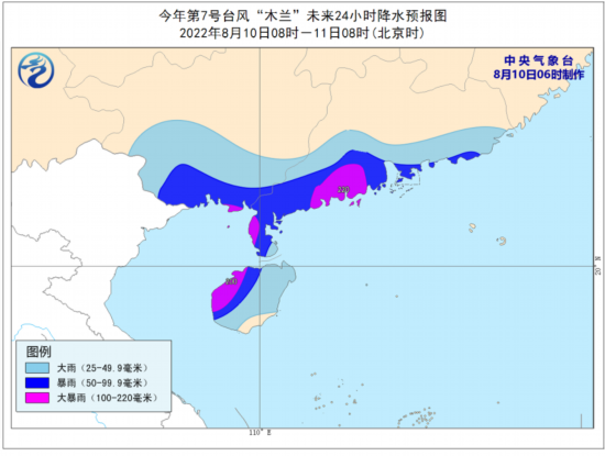 降水预报:8月10日08时至11日08时,广东南部、海南岛、广西南部等地有大雨或暴雨,其中,广东西南部、海南岛西北部的部分地区有大暴雨(100~220毫米)。