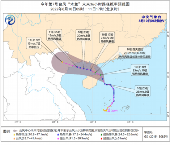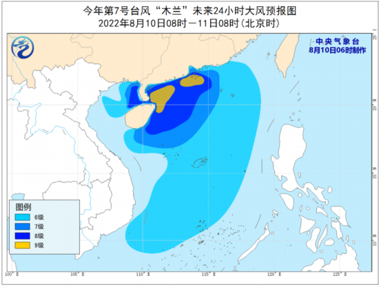 大风预报:8月10日08时至11日08时,南海大部海域、琼州海峡、北部湾和广东沿海、广西沿海、海南岛沿海、以及南沙群岛附近海域、西沙群岛附近海域、中沙群岛附近海域将有6-7级风,南海北部海域、北部湾东部、海南岛东部和北部沿海、广东中西部沿海风力有8-9级、阵风10-11级,局部海域风力可达10级、阵风11-12级。