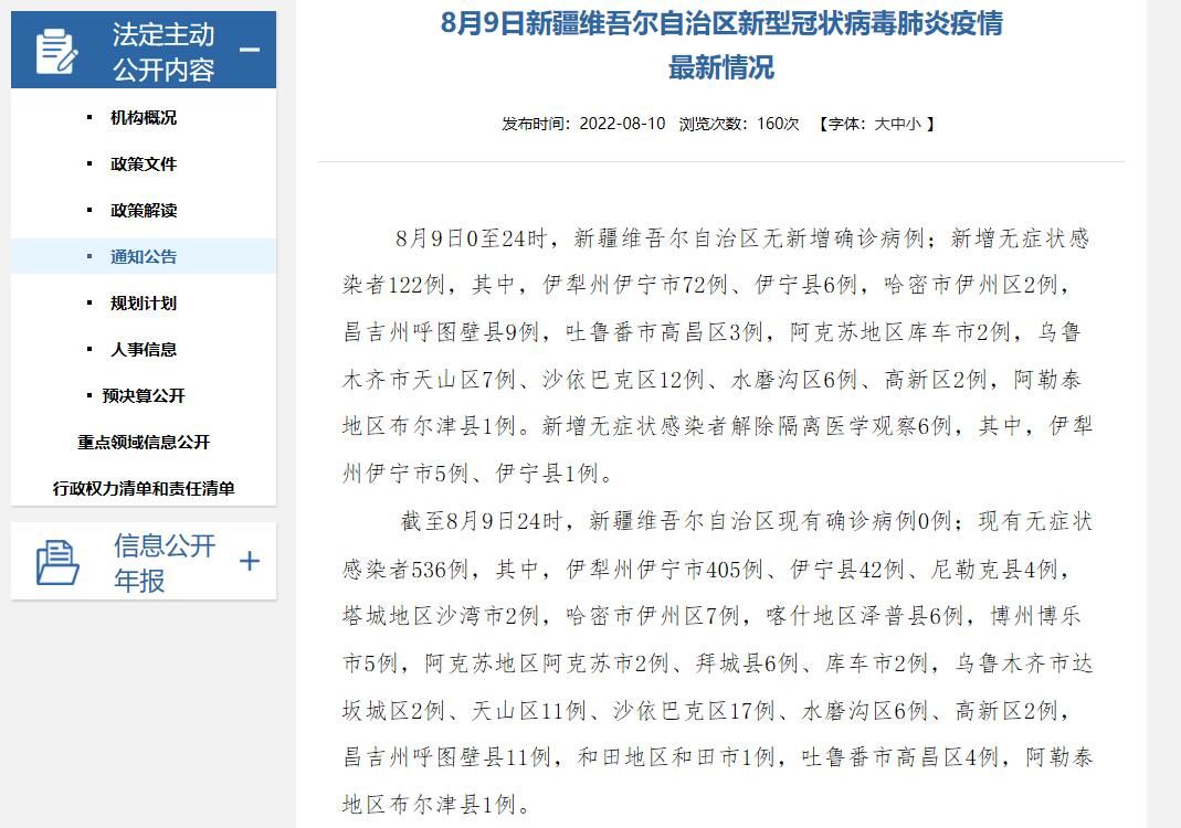 截至8月9日24时,新疆维吾尔自治区现有确诊病例0例;现有无症状感染者536例,其中,伊犁州伊宁市405例、伊宁县42例、尼勒克县4例,塔城地区沙湾市2例,哈密市伊州区7例,喀什地区泽普县6例,博州博乐市5例,阿克苏地区阿克苏市2例、拜城县6例、库车市2例,乌鲁木齐市达坂城区2例、天山区11例、沙依巴克区17例、水磨沟区6例、高新区2例,昌吉州呼图壁县11例,和田地区和田市1例,吐鲁番市高昌区4例,阿勒泰地区布尔津县1例。