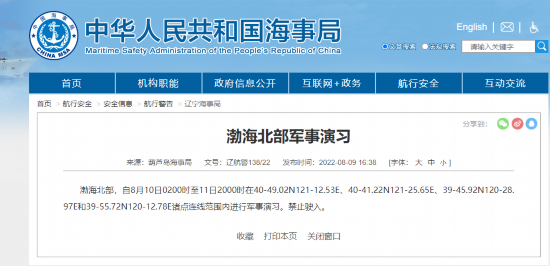 葫芦岛海事局发布航行警告,8月10日2时至11日20时,渤海北部部分海域(在40-49.02N121-12.53E、40-41.22N121-25.65E、39-45.92N120-28.97E和39-55.72N120-12.78E诸点连线范围内)进行军事演习,禁止驶入。