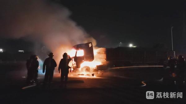 在火灾事故现场,赶来的消防员发现,此时大火已经将车头完全点燃,现场非常危险。根据现场情况,救援人员出动两支水枪对火势进行控制。最终,经过近10分钟的处置,火势得到控制,但是起火的货车车头烧毁严重。