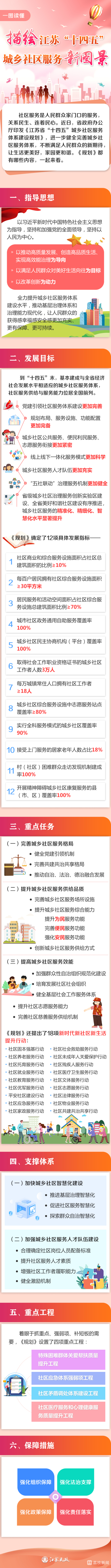 记者从省民政厅了解到,《规划》提出,到“十四五”末,江苏要基本建成与经济社会发展水平相适应的城乡社区服务体系,党建引领社区服务体系建设更加完善,规划布局、服务设施、功能配置更加完备;城乡社区公共服务、便民利民服务、志愿服务有效衔接;线上线下一体化服务模式更加科学;城乡社区服务人才队伍更加充实;“五社联动”治理服务机制更加健全;省级城乡社区治理服务创新实验区建设、全省美好和谐社区建设有序推进,城乡社区服务的精准化、精细化、智慧化水平显著提升。