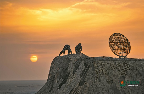 夕阳下,官兵快速进行伪装防护。