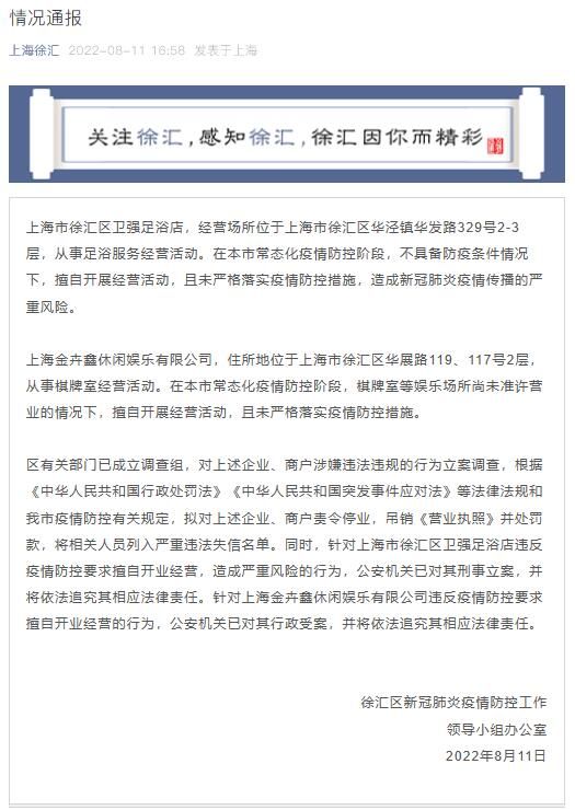 区有关部门已成立调查组,对上述企业、商户涉嫌违法违规的行为立案调查,根据《中华人民共和国行政处罚法》《中华人民共和国突发事件应对法》等法律法规和我市疫情防控有关规定,拟对上述企业、商户责令停业,吊销《营业执照》并处罚款,将相关人员列入严重违法失信名单。同时,针对上海市徐汇区卫强足浴店违反疫情防控要求擅自开业经营,造成严重风险的行为,公安机关已对其刑事立案,并将依法追究其相应法律责任。针对上海金卉鑫休闲娱乐有限公司违反疫情防控要求擅自开业经营的行为,公安机关已对其行政受案,并将依法追究其相应法律责任。