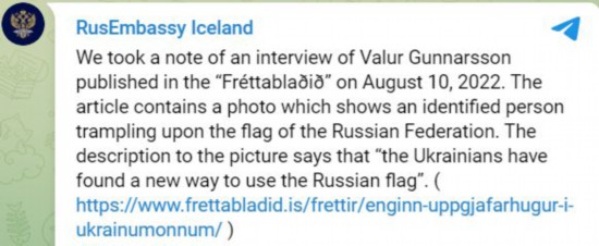 俄罗斯驻冰岛大使馆在声明中首先称,俄方注意到《Frettabladid》报10日刊发了一篇采访文章,其中的一张配图显示,一个人正踩踏俄罗斯国旗,图说是“乌克兰人找到了俄罗斯国旗的新用途”。俄使馆在这份声明中也附上了这篇文章的链接。