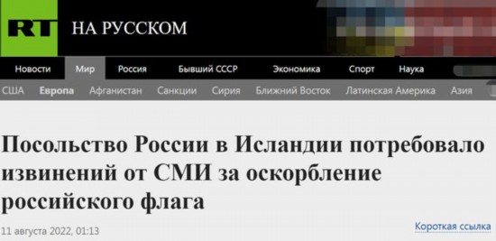 “俄罗斯驻雷克雅未克使馆希望该报刊编辑室为发布侮辱俄罗斯国家象征的素材正式道歉。”声明最后提出了这样的要求。