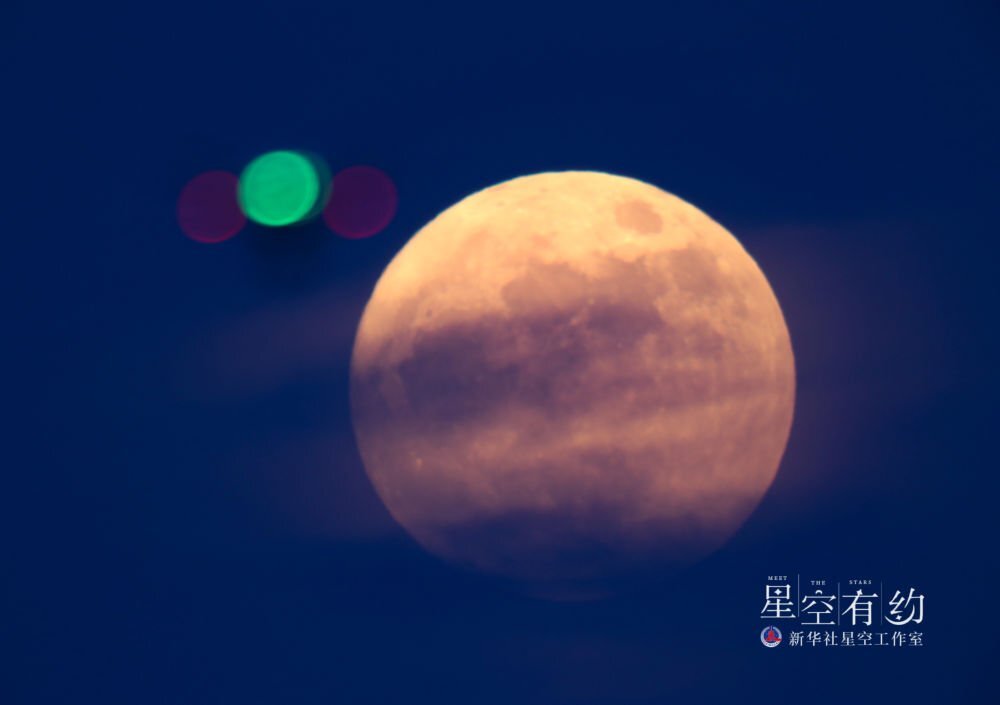 2022年6月14日,在土耳其伊斯坦布尔,一架飞机飞过年度第二大满月。(新华社记者沙达提摄)