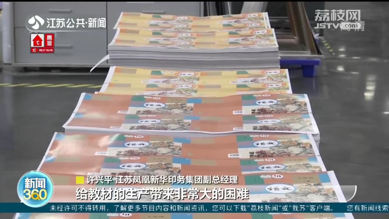 江苏凤凰新华印务集团副总经理许兴平说,今年教材生产有两大难题,第一是生产时间大幅缩短,由以往的3到4个月,压缩到今年只剩40天左右。第二是持续的高温天气,人员设备长时间高强度不停歇的运转,给教材的生产带来非常大的困难。预计统编三科教材(语文 历史 道德与法治)在18号左右能完成,其他教材在27号左右全部结束。