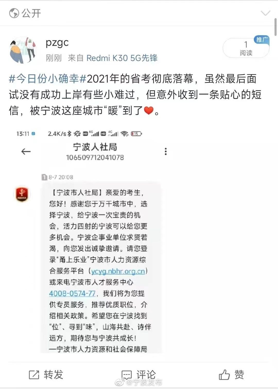 2022年宁波市级机关单位考录公务员面试日前结束,次日,1141名落榜者收到一条来自宁波市人力资源和社会保障局的短信:“宁波企事业单位求贤若渴,向您发出诚挚邀请,请登录‘甬上乐业’宁波市人力资源综合服务平台或来电宁波市人才服务中心,我们将为您提供专员服务,推荐优质职位,介绍政策。希望您在宁波找到‘位’、寻到‘味’,期待您与宁波共成长!”
