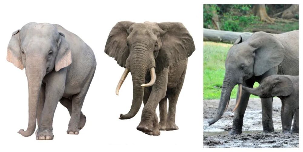 从左到右依次为:亚洲象,非洲草原象,非洲森林象。亚洲象头顶有两个明显的隆起,非洲草原象和非洲森林象有一个隆起,但非洲草原象的耳尖较尖,而非洲森林象的耳尖更圆润,象牙也更垂直向地面。
