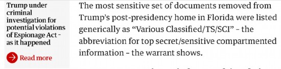 根据英国《卫报》的报道,从美国司法部公布的FBI对特朗普在美国佛罗里达州的海湖庄园别墅进行搜查的搜查令来看,被特朗普在卸任总统时从白宫带走的文件,并不是什么普通的文件,而是可能会令他危害美国国家安全、涉嫌违反美国《反间谍法》,以及涉嫌“妨害司法公正”的重要机密文件等敏感材料。FBI也正在就特朗普是否涉嫌犯下这些重罪而在进行调查。