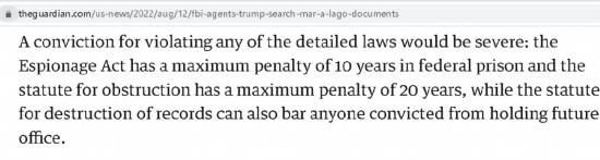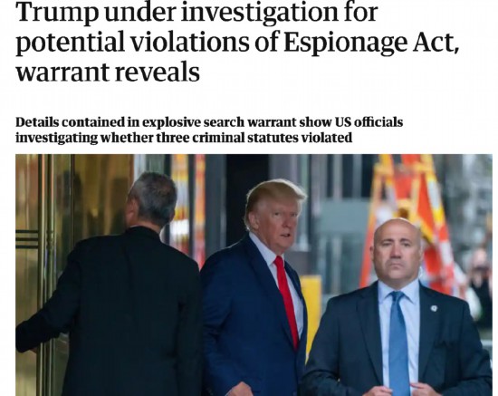 在美国前总统特朗普于当地时间周一被美国FBI“抄家”后,美国媒体曾一度认为此事可能与特朗普违法将白宫内部的一些机密文件带走有关。然而,从多家西方媒体的后续报道来看,特朗普涉及的问题远比只是带走了几份白宫文件要严重得多。因为在法庭批准的对他“抄家”的搜查令上,竟赫然写着包括违反《反间谍法》在内的等多项指控。
