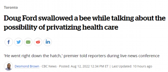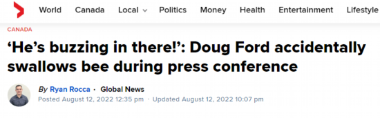 报道称,当时福特正接受记者提问、谈到安大略省的医护人员短缺等问题,一只蜜蜂就在其脸边盘旋,他还试图用手驱赶。但随后,蜜蜂飞进了福特嘴里。