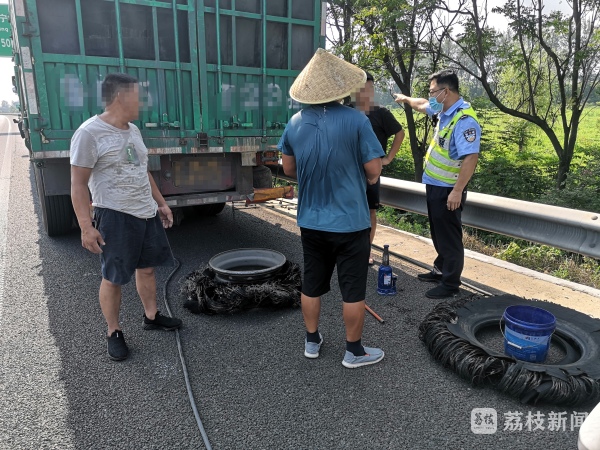8月11日下午15时许,徐州高速四大队民警巡逻至淮徐高速公路K139+800M时,发现一辆半挂货车和微型普通货车停靠在路边,车后方却未设置任何警示标识。民警下车询问后得知,半挂货车因轮胎高温爆胎无法继续行驶,为了省钱,便电话联系了微型普通货车前来帮忙修车。