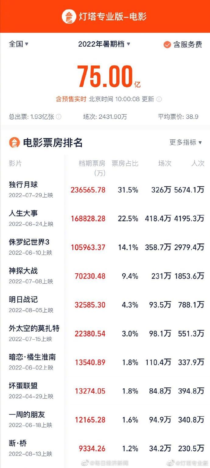 荔枝新闻讯 据灯塔专业版消息,截至8月14日10时,2022暑期档(6月1日-8月31日)总票房达75.00亿元(含预售),总场次2431.9万,总人次1.93亿。今年暑期档总票房已超过去年暑期档总票房73.81亿。
