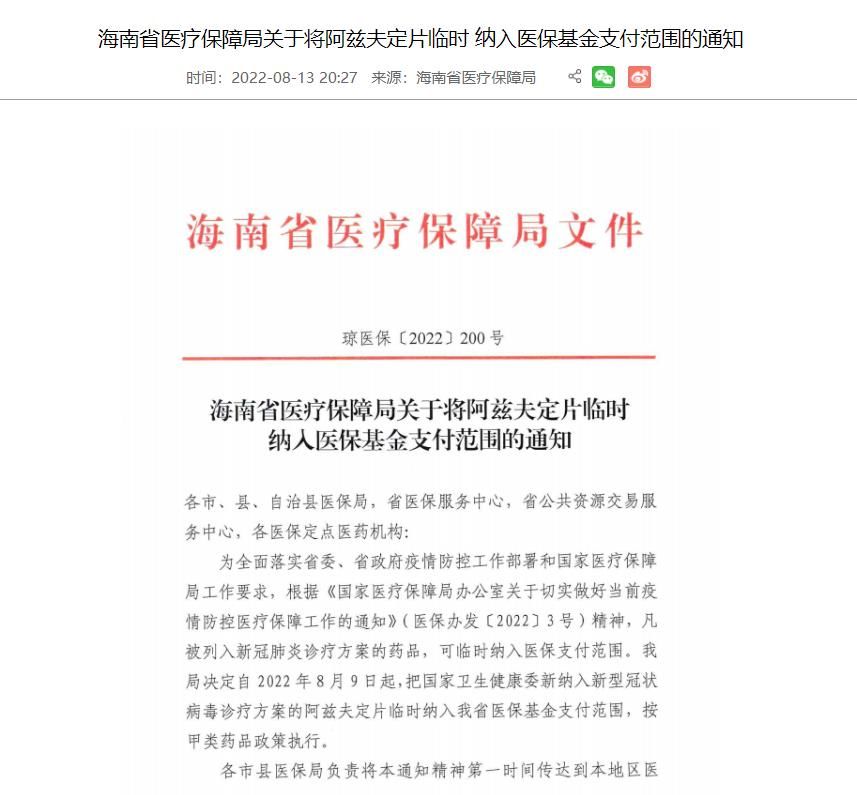 荔枝新闻讯 据海南省医疗保障局网站消息,8月13日,海南省医疗保障局发布相关通知,决定自2022年8月9日起,将国家卫生健康委新纳入新型冠状病毒诊疗方案的阿兹夫定片临时纳入海南省医保基金支付范围,按甲类药品政策执行。