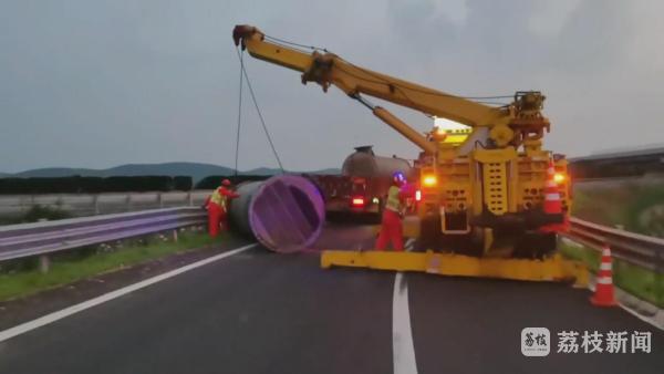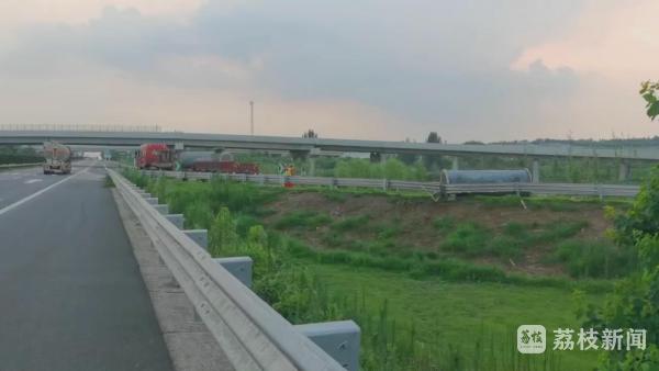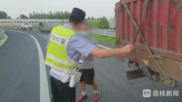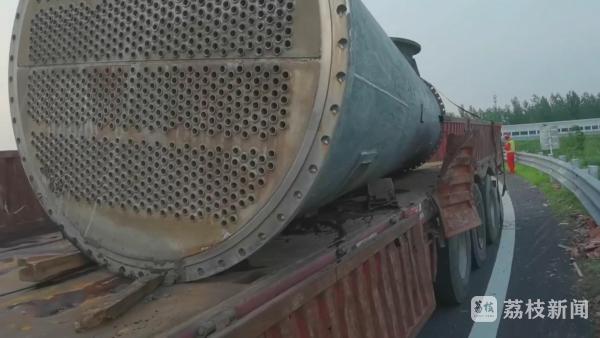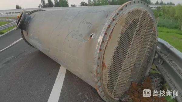 徐州高速二大队民警赶到事故现场时,货车驾驶员说,掉落的这个是重达12吨的冷却罐,当时货车上装载了两个,没想到刚上高速,还没驶离匝道,绑罐体的绳子就突然断了,其中一个冷却罐直接滚了下来,高速护栏也被压变形,好在当时后方没有车辆,否则后果不堪设想!