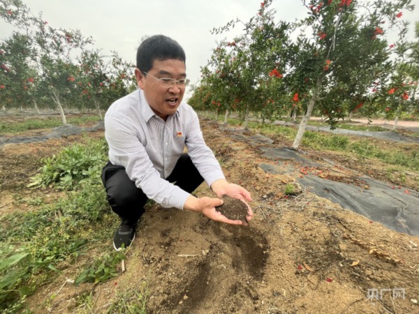 张家祥介绍石榴树下的生物有机肥(央广网发 张惟一 摄)