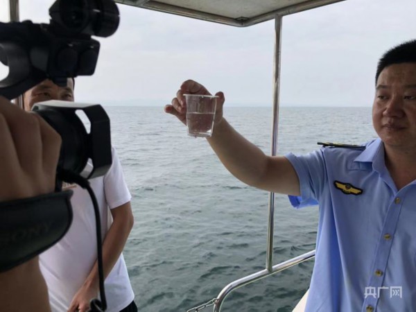 淅川县丹江库区综合执法人员向记者展示丹江水质(央广网发 张惟一 摄)
