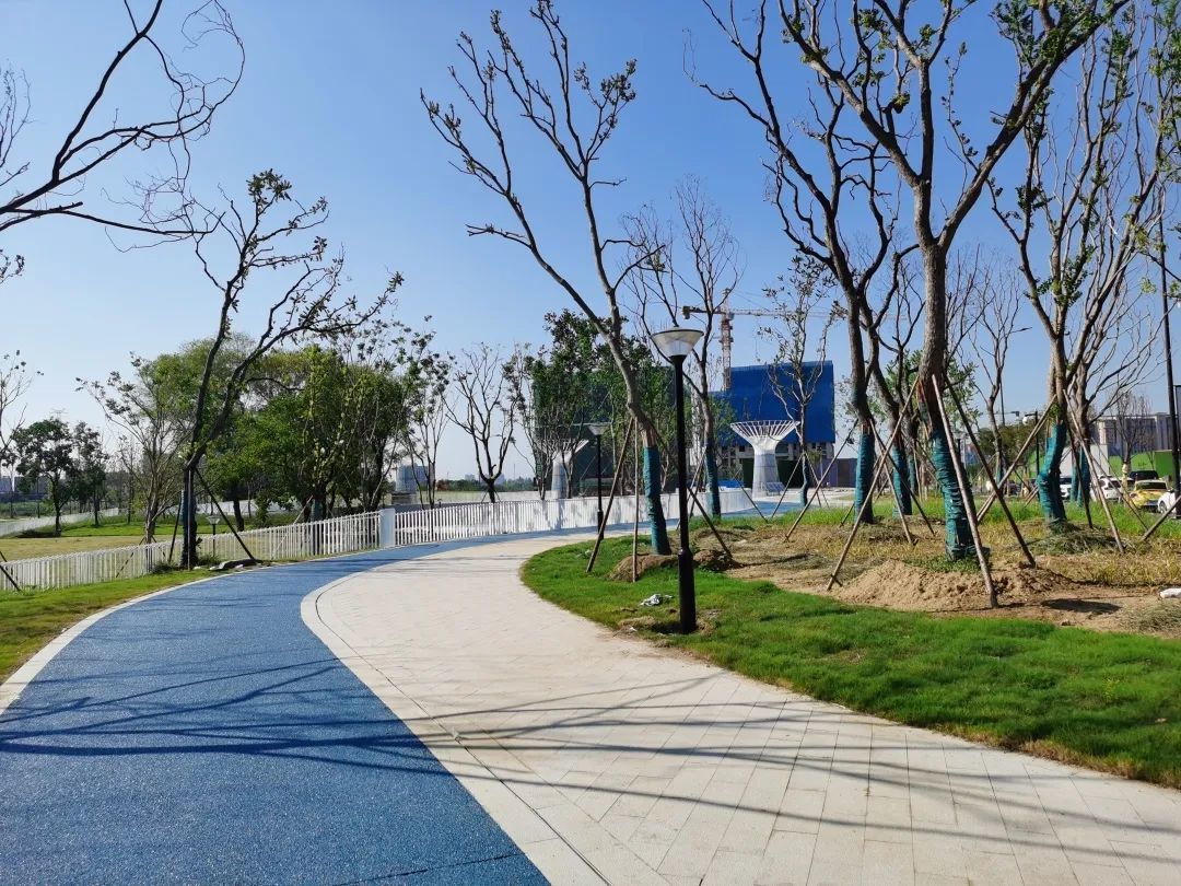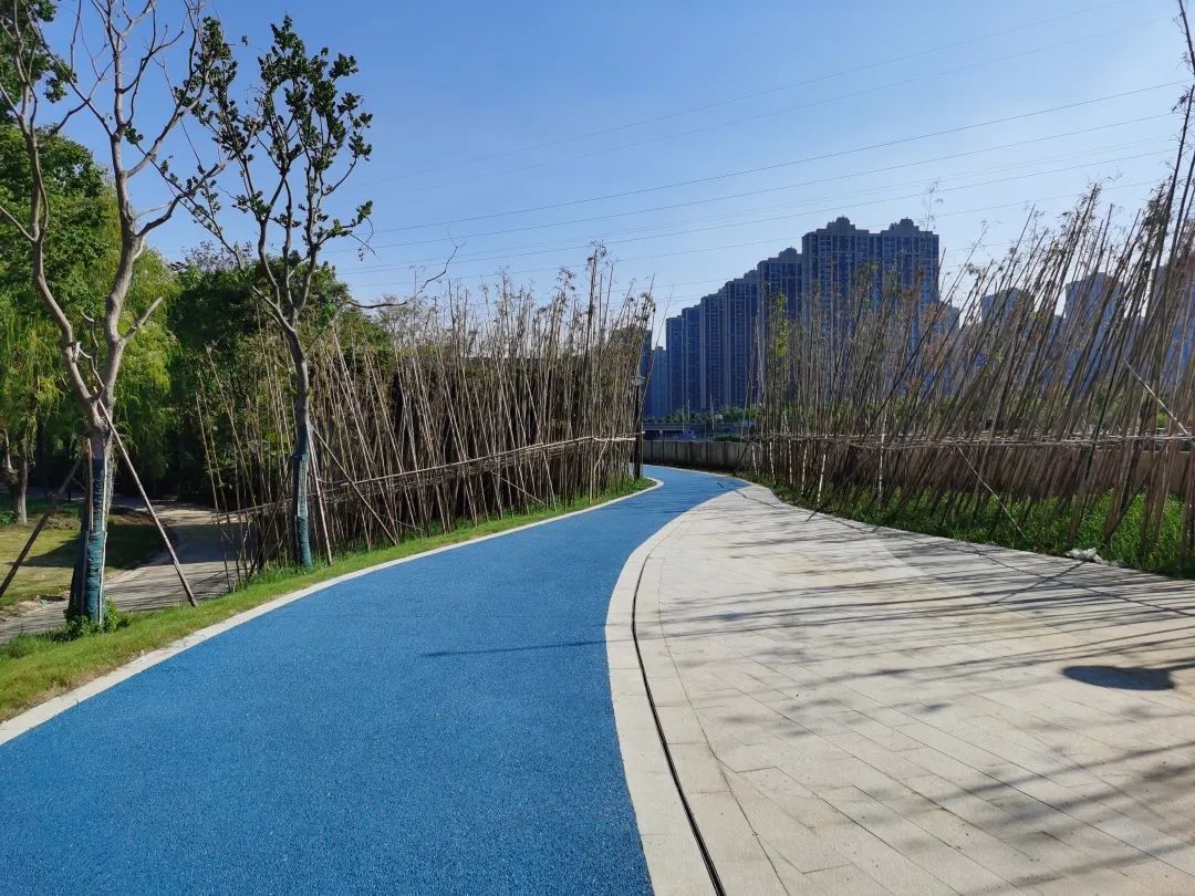自公园南区西入口进入,可见外绕公园一圈近1000米的蓝色健身步道已铺设完成。