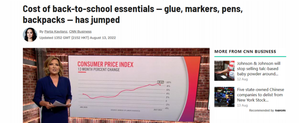 中国日报网8月15日电(党超峰)据美国有线电视新闻网(CNN)13日报道,美国学校即将开学,而受高通胀影响,从胶水,钢笔到背包,运动鞋等学生用品的价格较去年大幅上涨。即便家长们谨慎调整家庭预算,整体花费加起来还是令人咋舌。